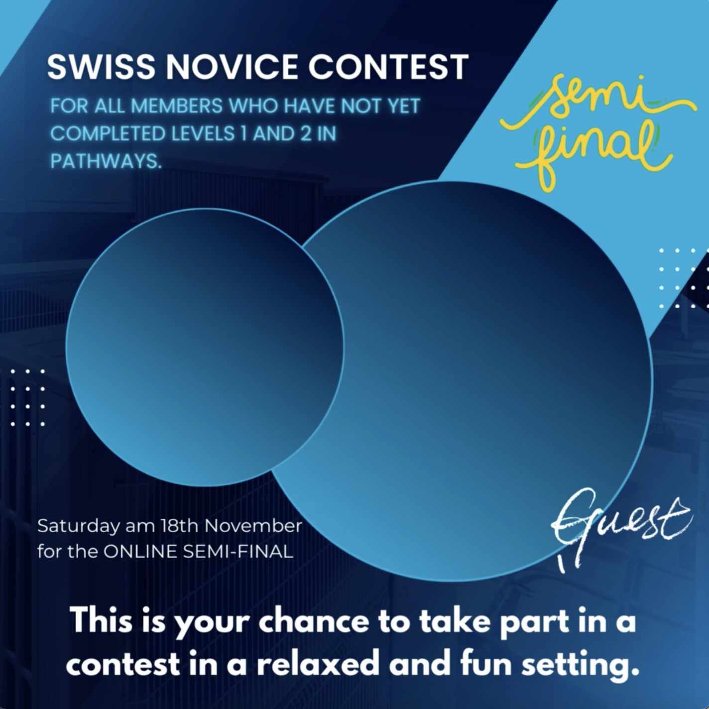 Swiss Novice Contest: semi-finals by Romandie Speakers | 12 Nov 2023 Registrations have closed. Swiss Novice Contest: semi-finals by Romandie Speakers 14 14 people viewed this event. Event registration closed. Date And Time 18.11.23 @ 09:00 to 18.11.23 @ 13:00 Registration End Date 17.11.23 Location Online event Share With Friends Facebook Twitter Linkedin Xing Pinterest